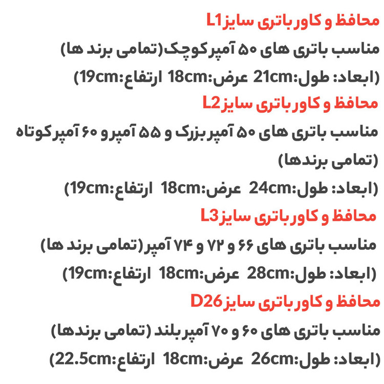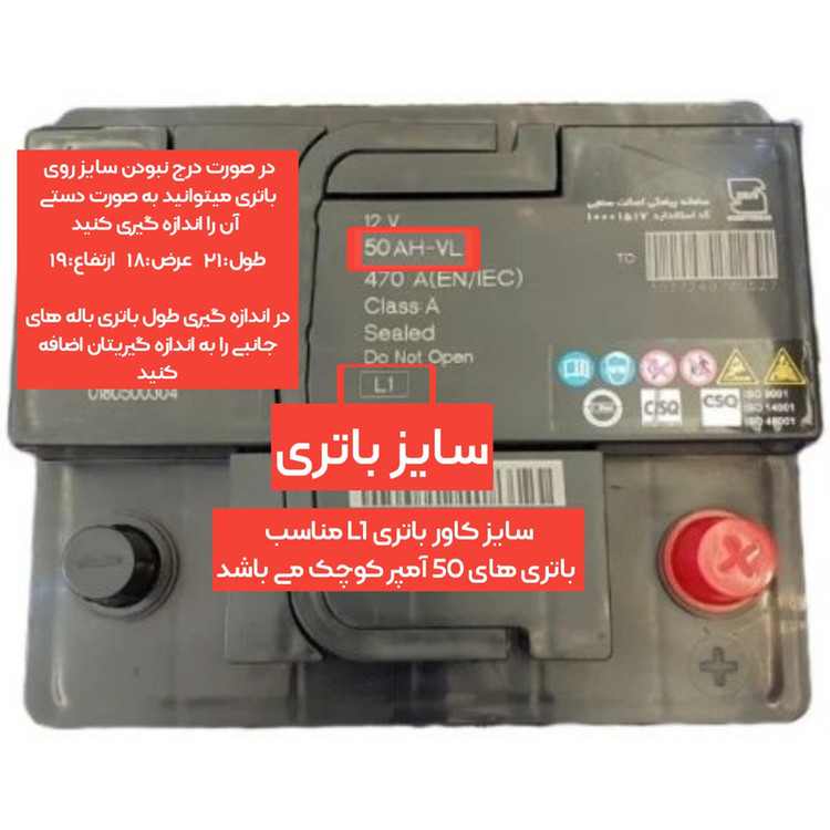این مدل محافظ باتری مناسب 50 آمپر بزرگ نیست و برای تهیه این مدل باید محافظ و کاور باتری خودرو مدل L2 را سفارش دهید.