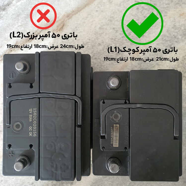 قبل از خرید لطفا به این نکته توجه داشته باشید که باتری های 50 آمپر در دو سایز تولید می شوند ، باتری 50 آمپر بزرگ و کوچک . طول باتری های 50 آمپر بزرگ 24cm و طول باتری های 50 آمپر کوچک 21cm می باشد ( عرض و ارتفاع هر دو یکی می باشد )